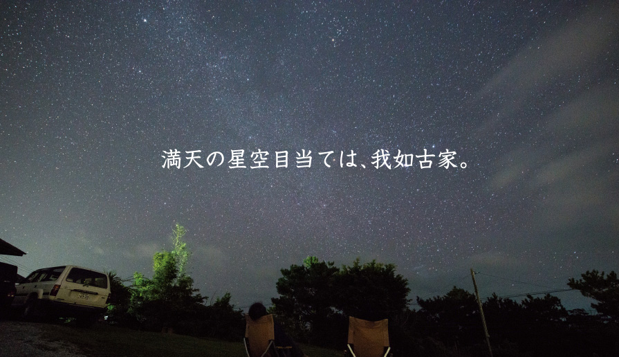 小高い丘の上に、お家を構える現役ハルサー我如古さん。畑で採れた季節の食材を使って、奥さんの手作りおやつで皆さんをおもてなし。素朴な味が、やめられない止まらない。愛車はランドクルーザー。仲良くなれば近くのデコボコ道へご案内してくれるかも。そして、街灯がない場所なので、夜になると暗闇に包まれた空間で、満天の星空を独り占めできます。