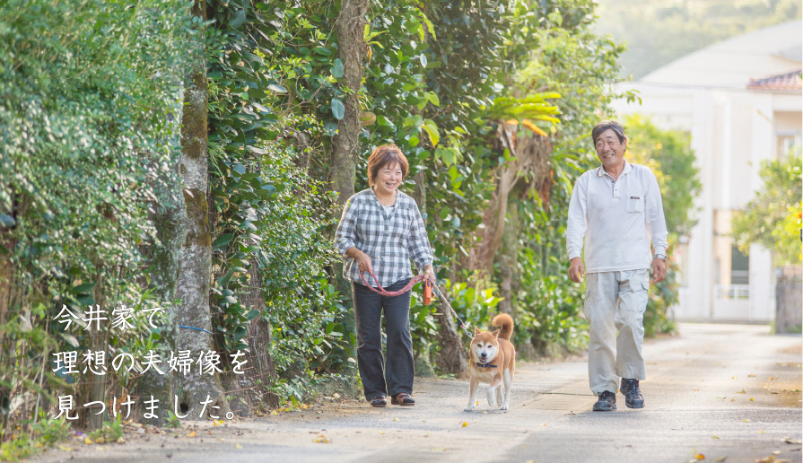 フクギ並木と一緒に、そっと佇む今井さんのお家は、愛犬「そら」がみなさんを出迎えてくれる、アットホームな家庭。夫婦共々、飾らない気さくな態度に、なぜか心が緩んでしまう。今井家がある集落は、人の手によって作られた、古くから残る景色がたくさんあります。環境に合わせた人間の知恵。タイムスリップした感覚で、集落散策をお楽しみください。