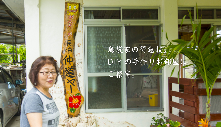 DIY好きにはたまらない宿泊先のご紹介。自宅で美容室を営む島袋家は、あれもこれも、目に入るも全てが、手作りによるものばかり。キッチン、トイレ、シャワールームといった水周りも、旦那様自慢の手作り。看板も、もちろんDIY!廃材も、旦那様の手にかかれば、綺麗な家具に大変身!興味のある方は、タイミングを見て手ほどきを教えてもらってくださいね!